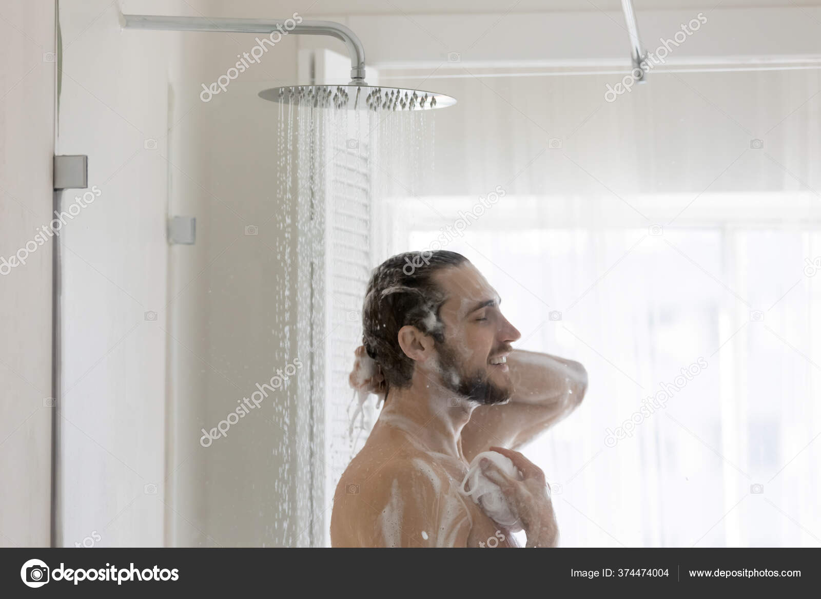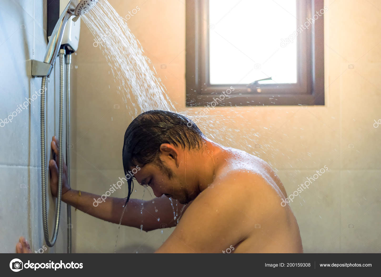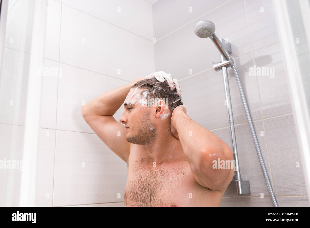 Handsome guy taking a shower in the modern tiled bathroom Stock Photo - Alamy