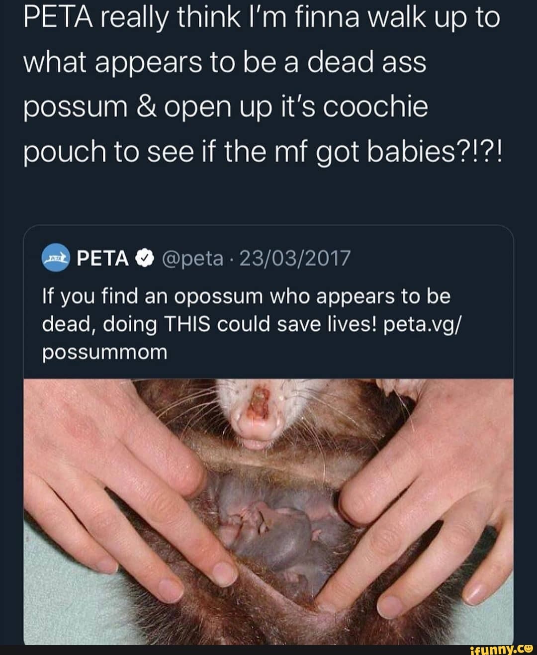 PETA really think I'm finna walk up to what appears to be a dead ass possum & op