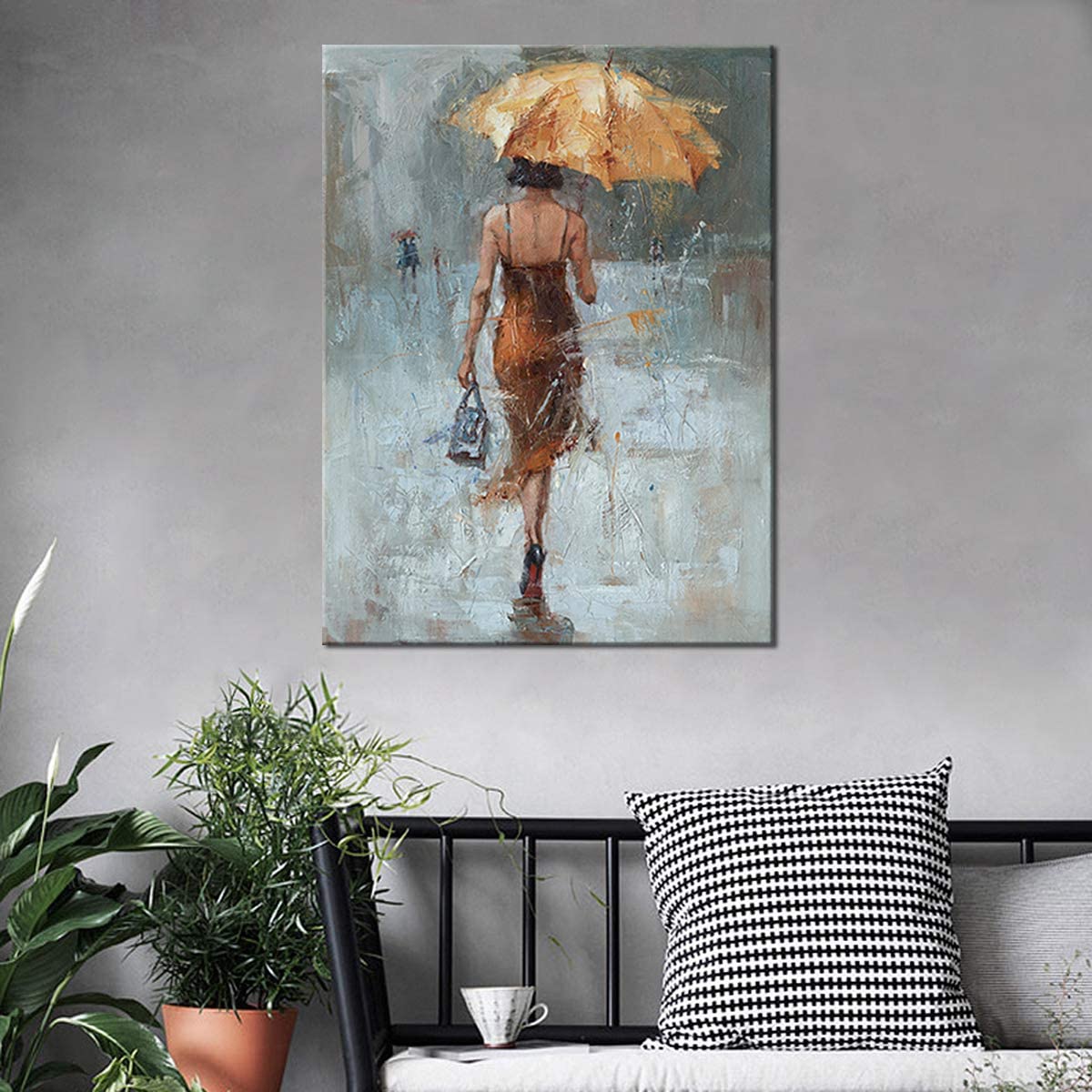 Canvas Wall Art Girl Umbrella With Khaki Dress Walking in Street Rain Painting M